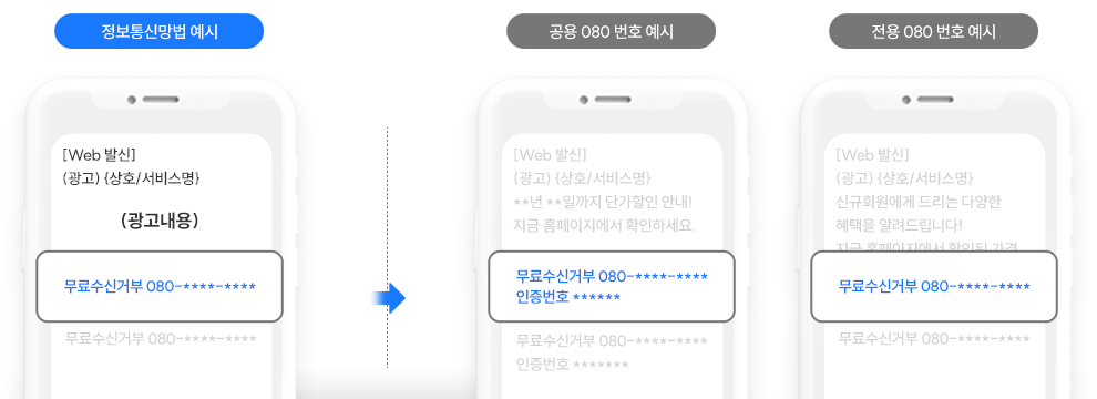 | 웹회원에게 제공하는 무료 080 수신거부 번호 | 개통을 통한 개인 080 수신거부 번호 부여 |