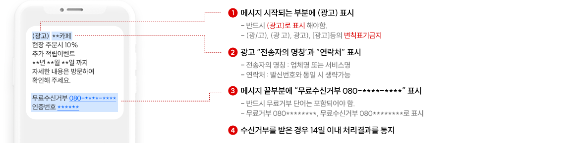 필수 기재 사항 : (광고), 전송자 명칭, 연락처, 무료수신거부
