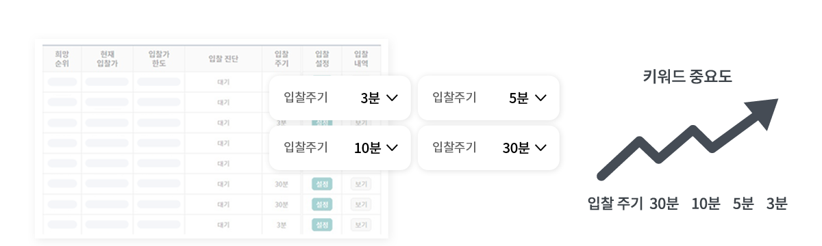키워드별 중요도에 따라 3분, 5분, 10분, 30분 별도 입찰 주기 설정 가능