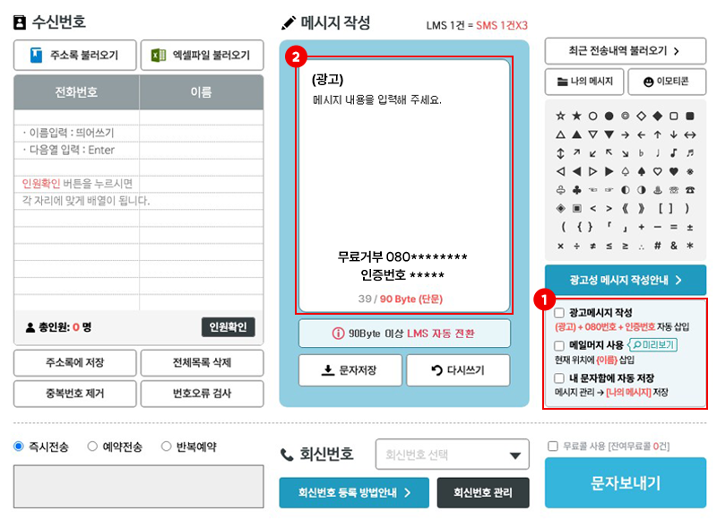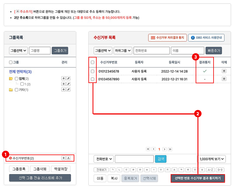1. 주소록 관리 메뉴에서 수신거부번호 클릭하여 목록 조회