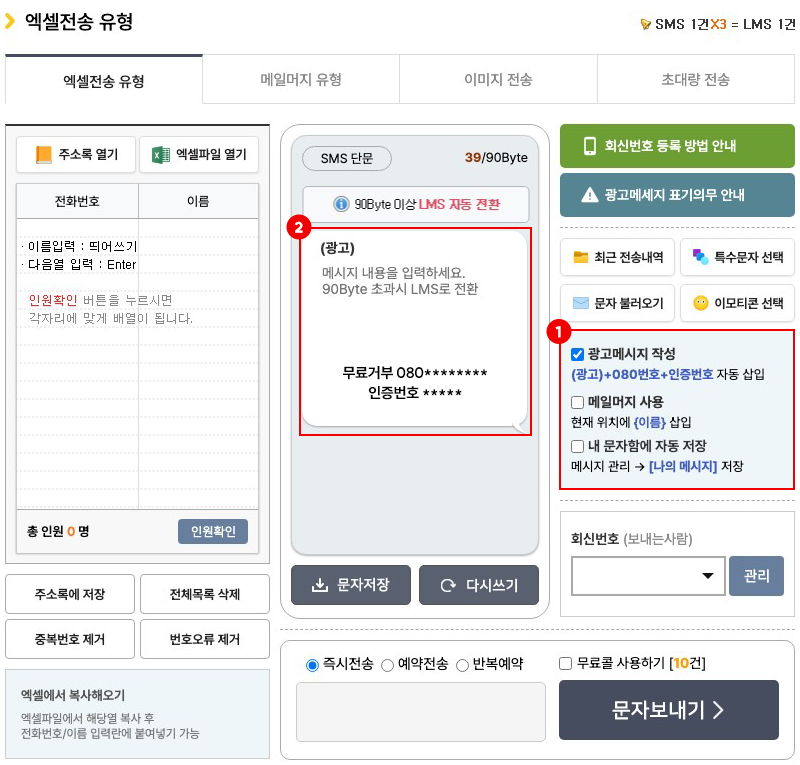 - 영리목적의 광고성 정보전송시 (광고), 전송자의 명칭, 연락처, 무료 수신거부가 표기되어야 합니다.