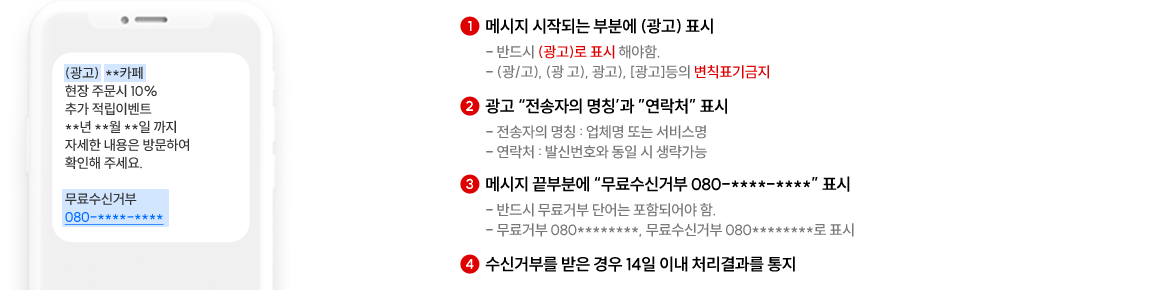 필수 기재 사항 : (광고), 전송자 명칭, 연락처, 무료수신거부