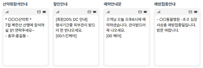 업종별 맞춤 이모티콘 제공으로 광고문자를 더 특색 있고 편리하게 전송!- 학교, 학원, 쇼핑몰, 동호회, 병의원, 미용 등 다양한 카테고리 제공