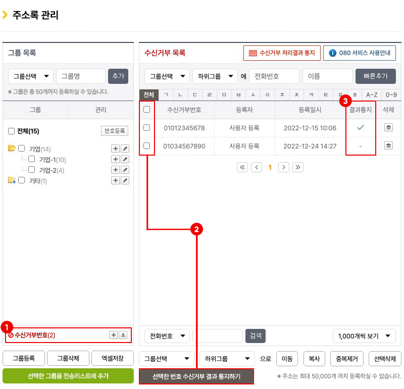 1. 주소록 관리 메뉴에서 수신거부번호 클릭하여 목록 조회