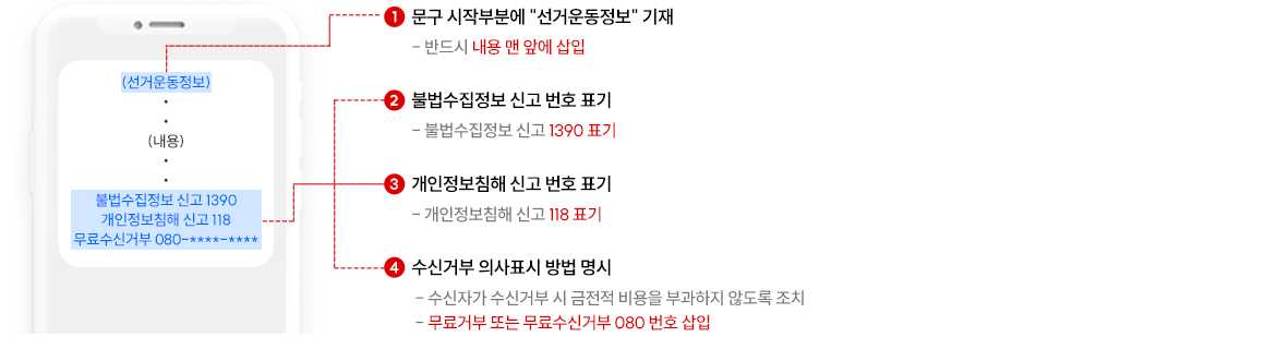 선거문자작성 순서 : ①(선거운동정보) > 내용 > ② 불법수집정보 신고 번호 > ③ 개인정보침해 신고 번호 > ④ 무료수신거부 번호