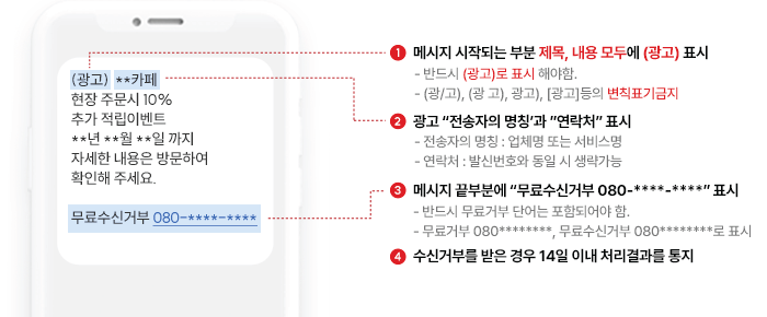 필수 기재 사항 : (광고), 전송자 명칭, 연락처, 무료수신거부